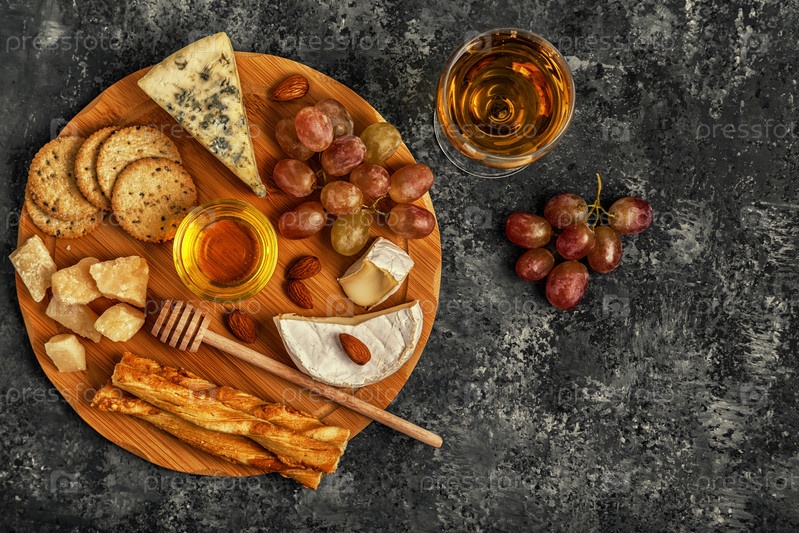 Ассорти из сыра с вином, медом, орехами и виноградом на разделочной доске