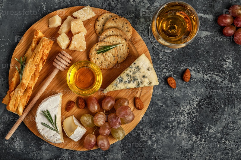 Ассорти из сыра с вином, медом, орехами и виноградом на разделочной доске