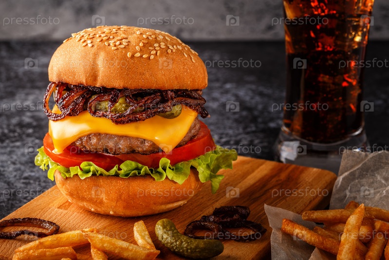 Бургер, гамбургер с картофелем фри и свежими овощами