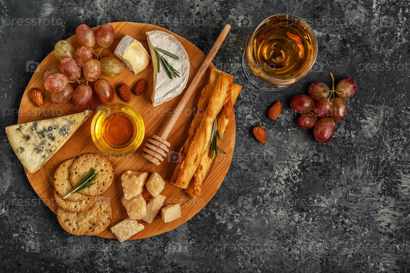 Ассорти из сыра с вином, медом, орехами и виноградом на разделочной доске