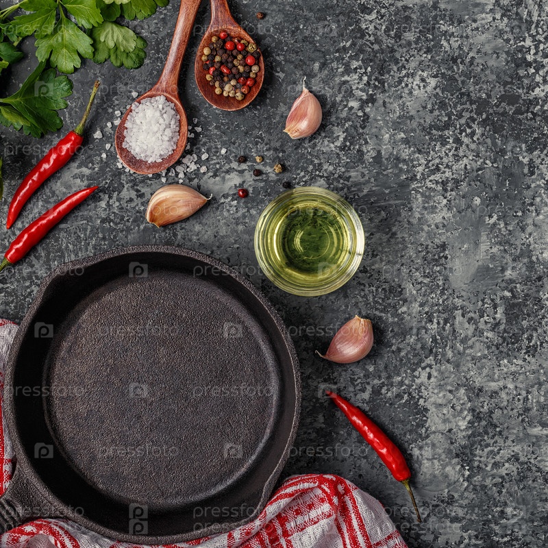 Фон со специями, травами, оливковым маслом и сковородой для приготовления пищи