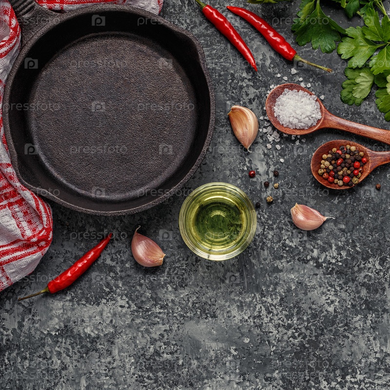 Фон со специями, травами, оливковым маслом и сковородой для приготовления пищи