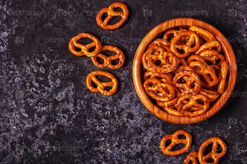 Соленый крендель в миске на каменном фоне