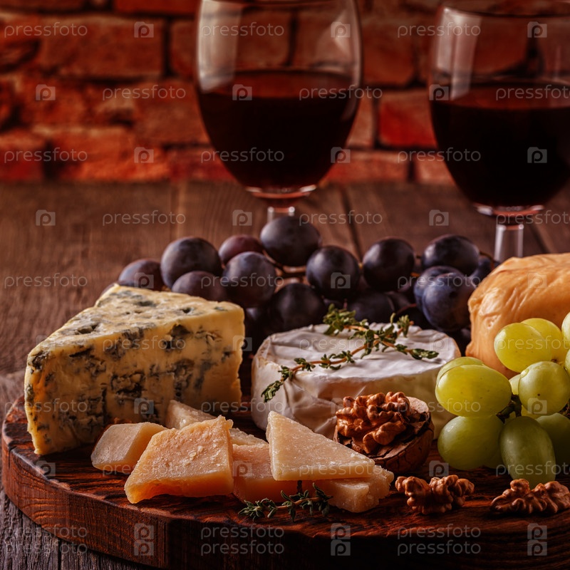 Сыр, орехи, виноград и красное вино на деревянном фоне