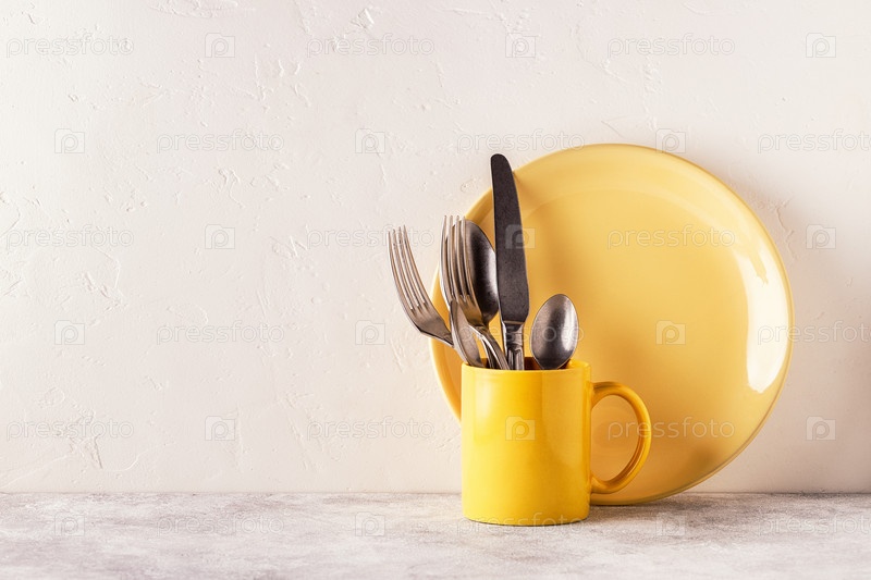 Посуда и столовые приборы на светлом столе