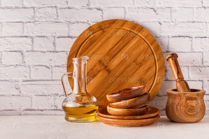 Деревянная посуда на белом столе