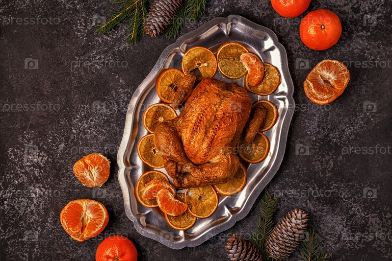 Жареная целая курица с рождественским украшением
