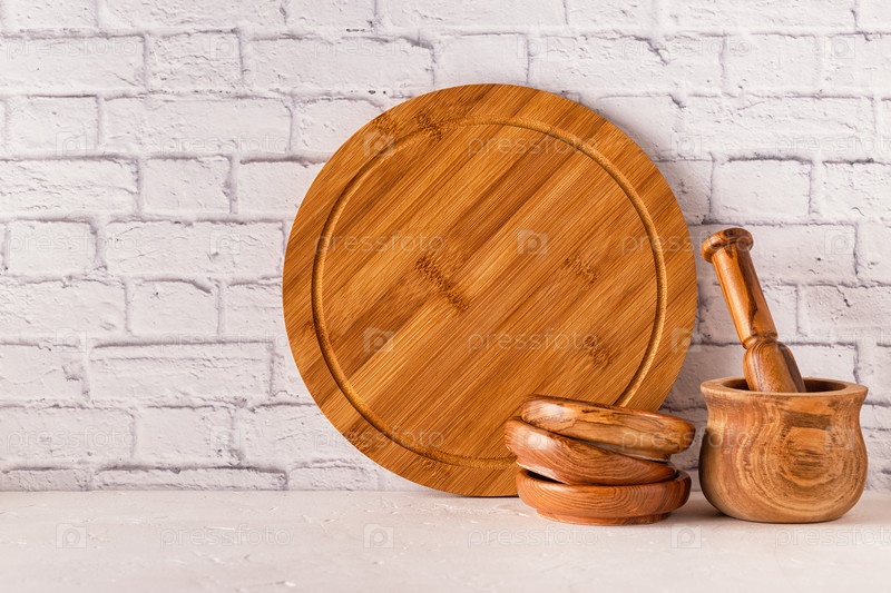 Деревянная посуда на белом столе