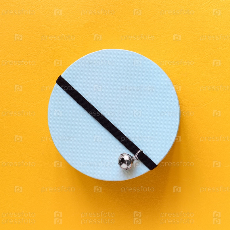 Синяя круглая подарочная коробка с колокольчиком на ленте на желтом фоне