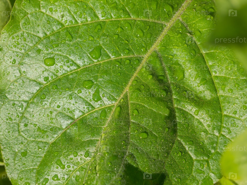 Зеленый лист с каплями воды после дождя крупным планом. Текстура ярко-зеленых листьев с каплями воды, мягкий фокус