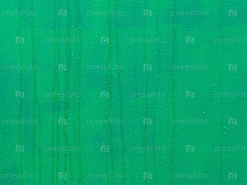 Текстура капель воды с пятнами на зеленой поверхности. Капли воды на бирюзовом фоне