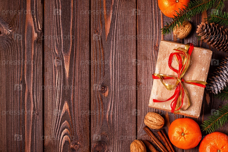Рождественская композиция с мандаринами, подарочными коробками, шишками на темном деревянном фоне