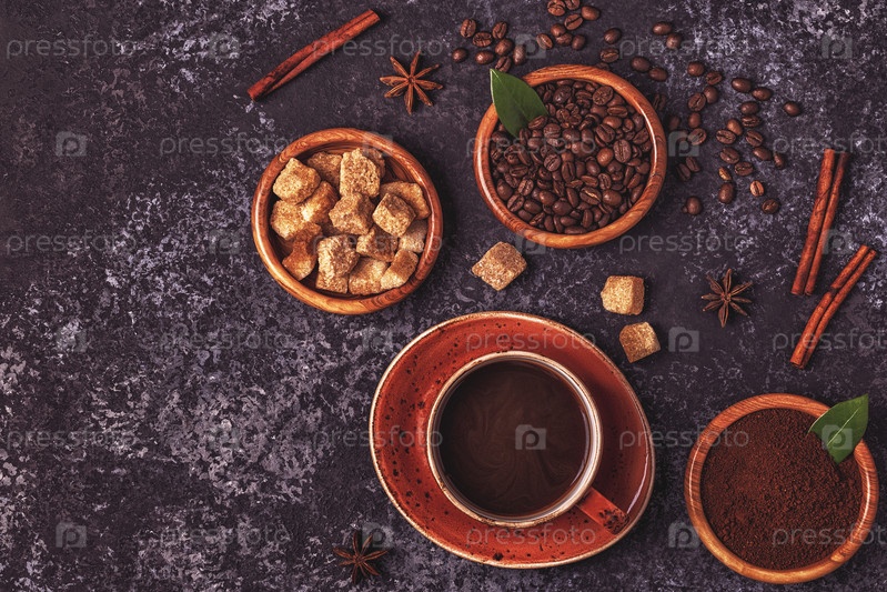 Кофейная чашка, бобы, молотый порошок и сахар