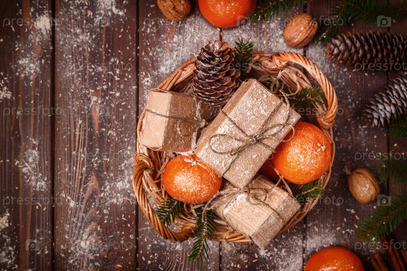 Рождественская композиция с мандаринами, подарочными коробками, шишками на темном деревянном фоне