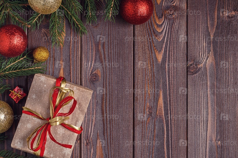 Рождественские подарочные коробки и елка на деревянном фоне