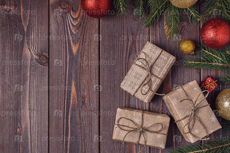 Рождественские подарочные коробки и елка на деревянном фоне