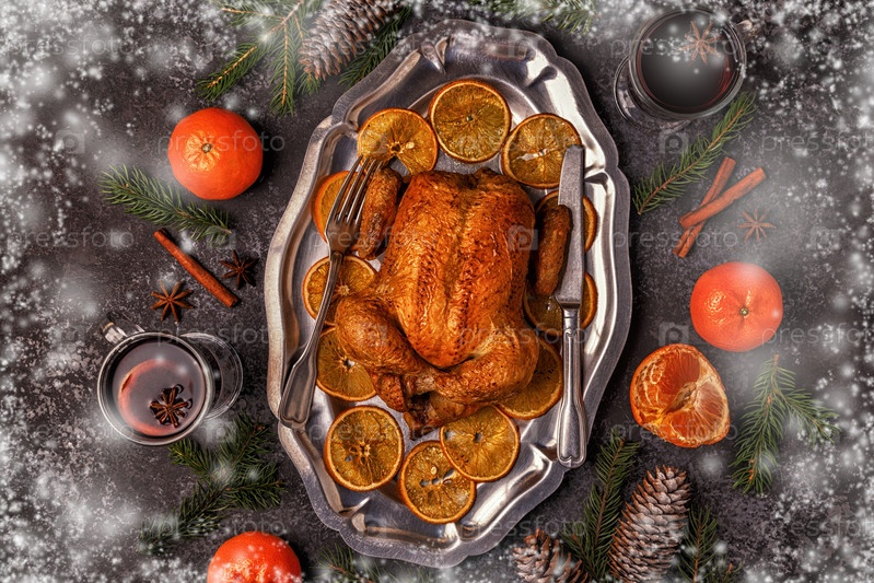 Жареная целая курица с рождественским украшением