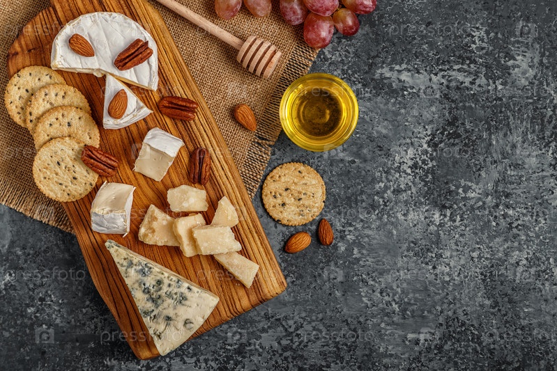 Ассорти из сыра с медом, орехами и виноградом на разделочной доске