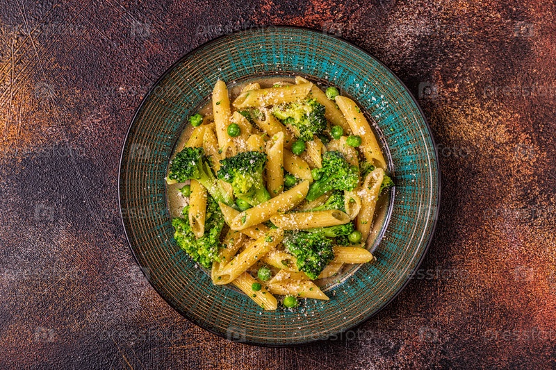 Паста с брокколи, зеленым горошком, чесноком, сыром