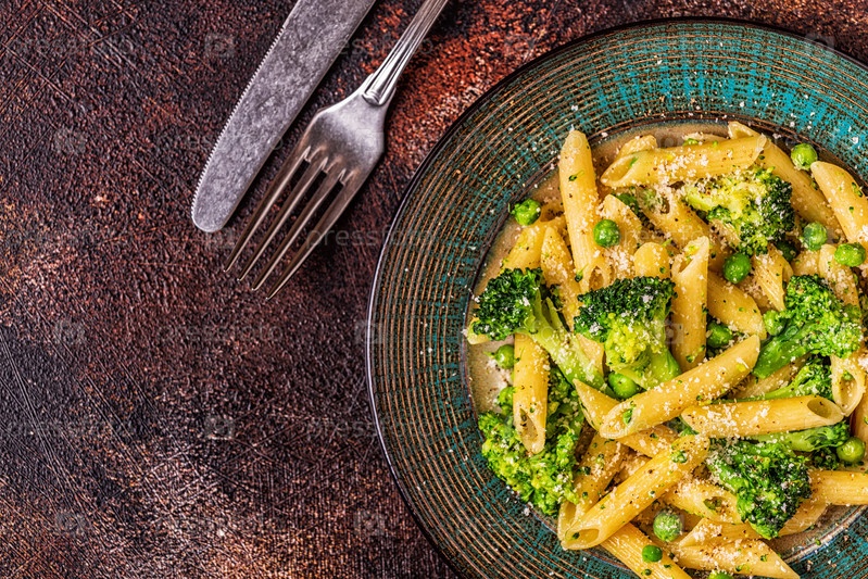 Паста с брокколи, зеленым горошком, чесноком, сыром
