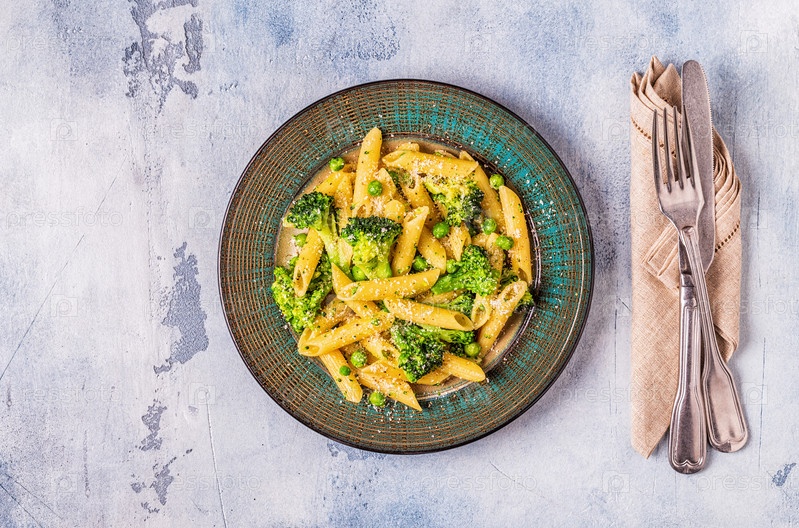 Паста с брокколи, зеленым горошком, чесноком, сыром
