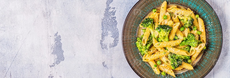 Паста с брокколи, зеленым горошком, чесноком, сыром