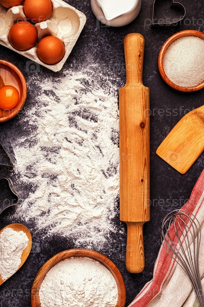 Ингредиенты для выпечки - мука, деревянная ложка, скалка, яйца