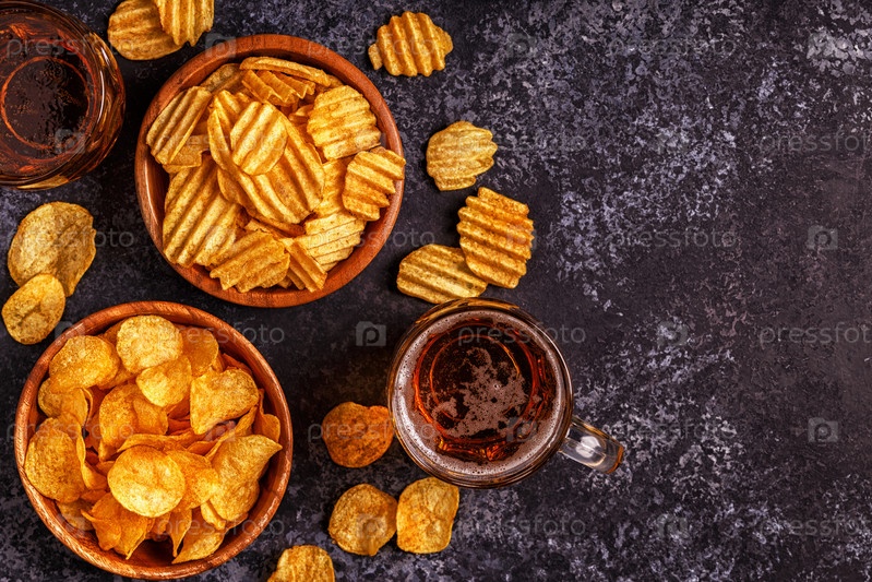 Пиво и хрустящие картофельные чипсы на каменном фоне