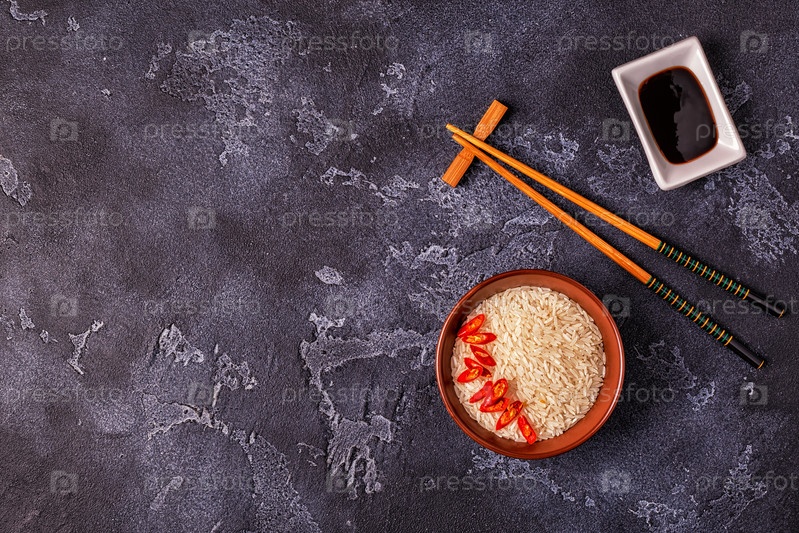 Рис в миске и деревянные палочки для еды