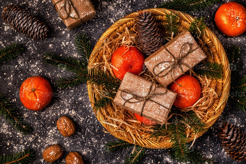 Рождественская композиция с мандаринами, подарочными коробками, шишками