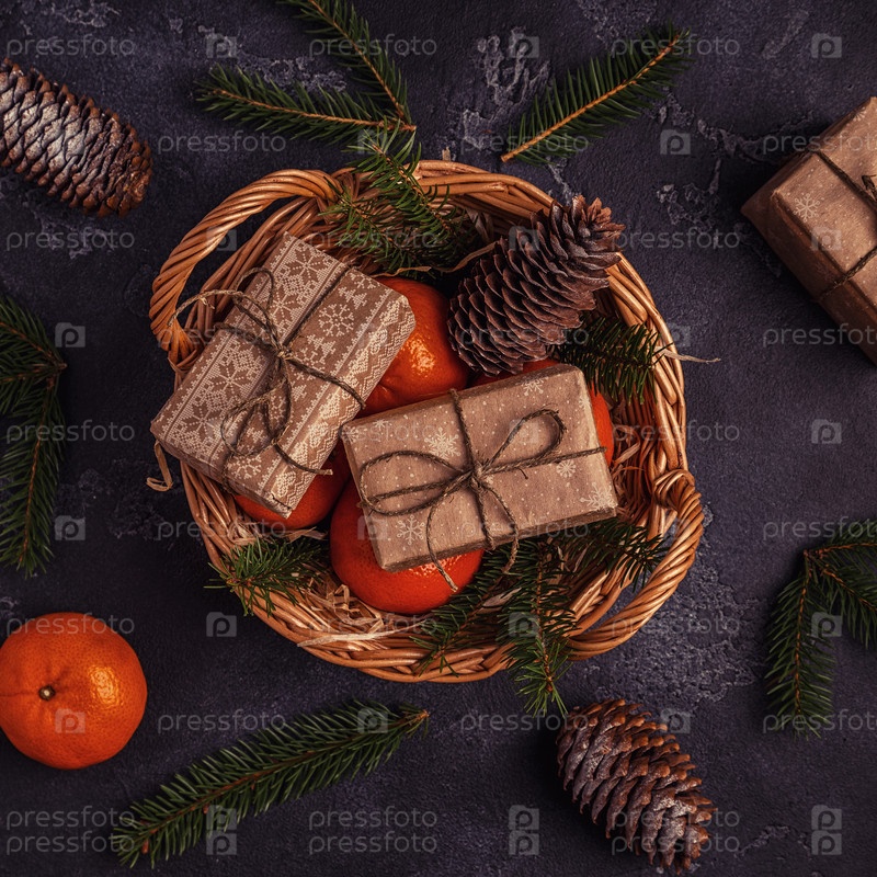 Рождественская композиция с мандаринами, подарочными коробками, шишками