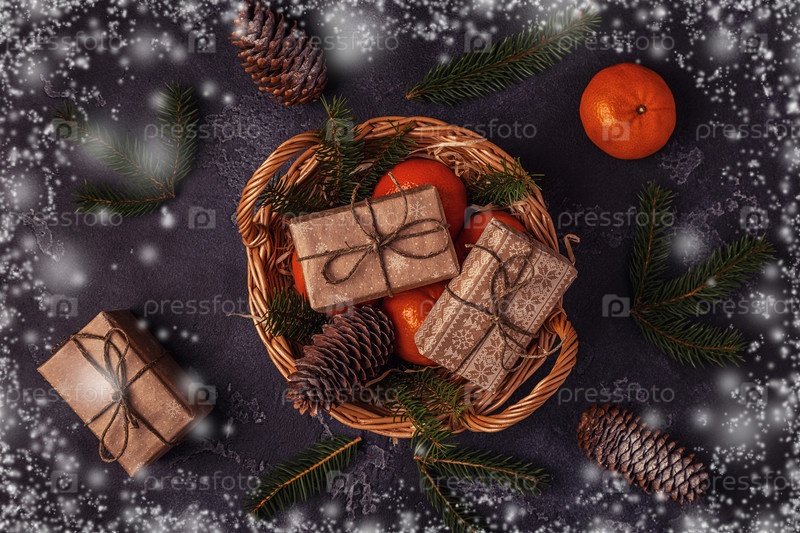 Рождественская композиция с мандаринами, подарочными коробками, шишками