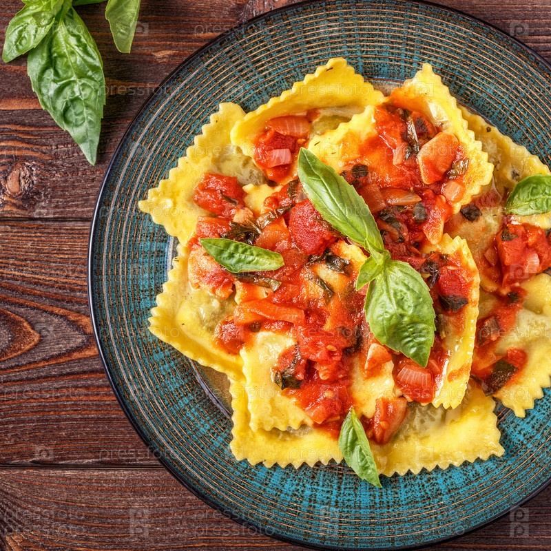 Равиоли с томатным соусом и базиликом на темном фоне