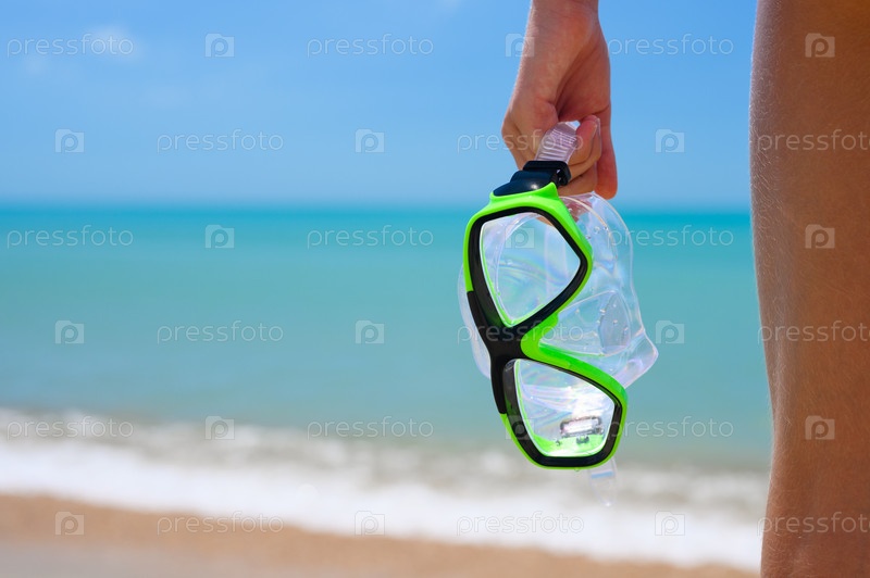 Маска для дайвинга в руке на фоне моря в солнечный день