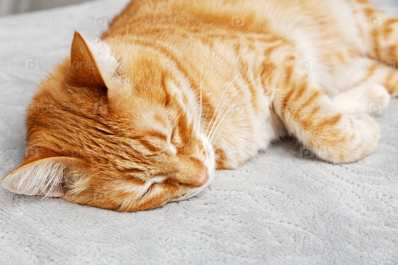 Крупным планом портрет рыжего рыжего кота, спящего на кровати