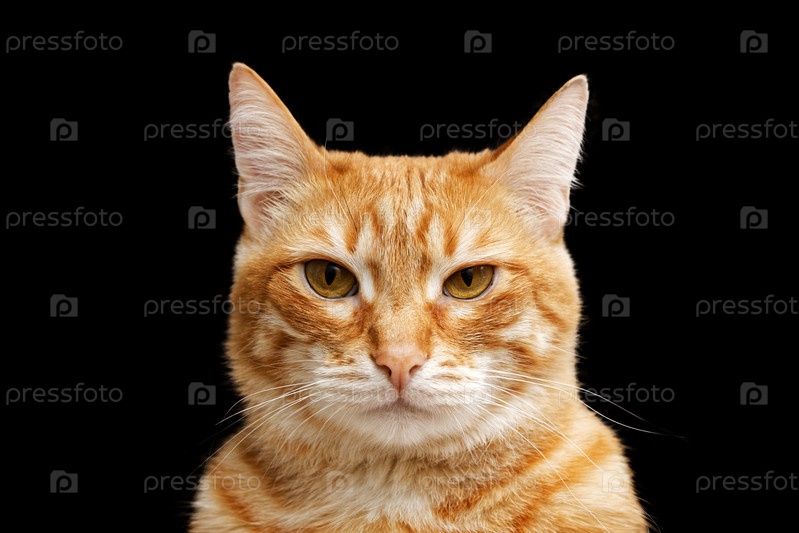 Портрет крупным планом серьезного рыжего кота, смотрящего прямо в камеру. Изолированные на черном фоне. Мелкий фокус