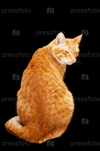Вид сзади на сидящего рыжего кота, который обернулся с обиженным взглядом. Изолированные на черном фоне