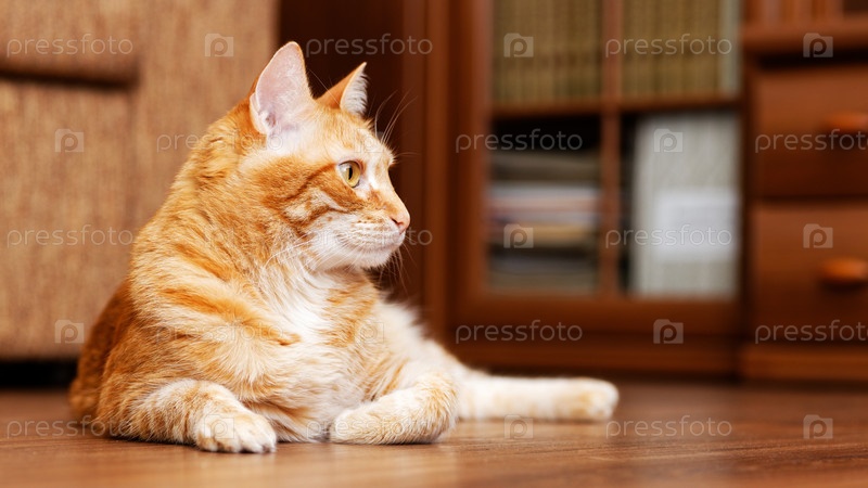 Крупным планом портрет рыжего кота, лежащего на деревянном полу и смотрящего в сторону на размытом фоне. Мелкий фокус