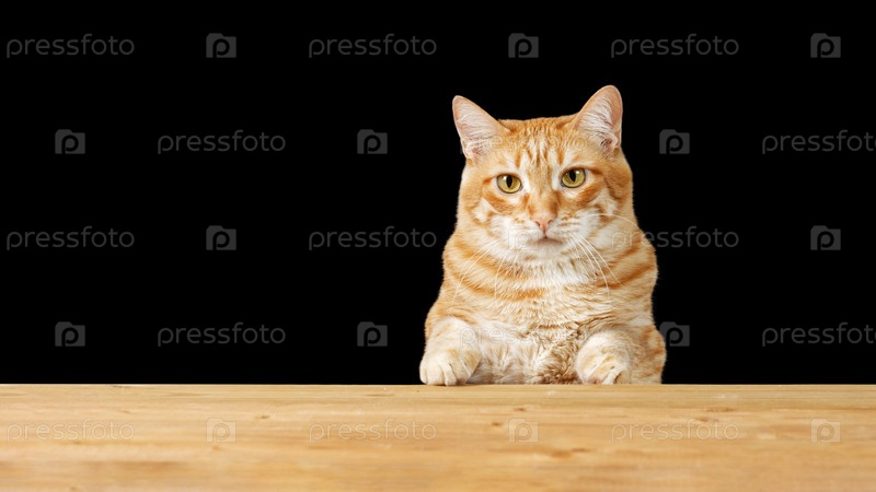 Рыжий кот сидит за пустым деревянным столом на черном фоне. Копипространство