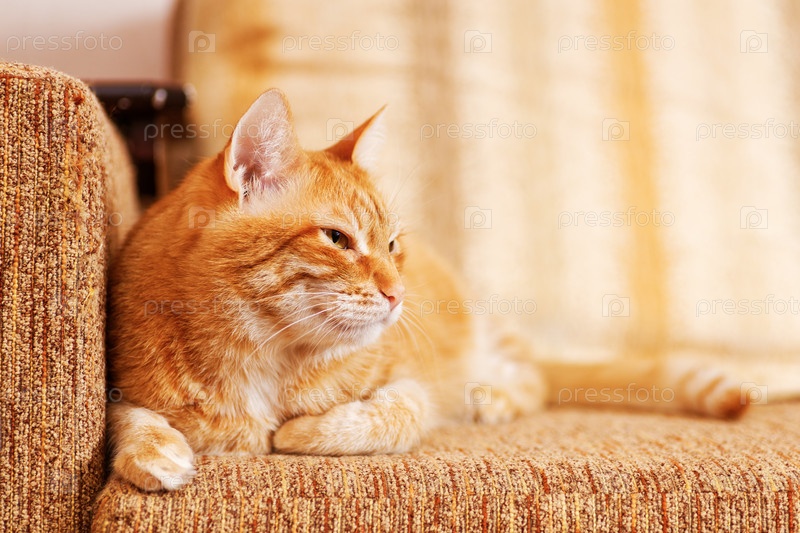 Крупным планом портрет рыжей домашней кошки, лежащей на диване. Мелкий фокус. Копипространство
