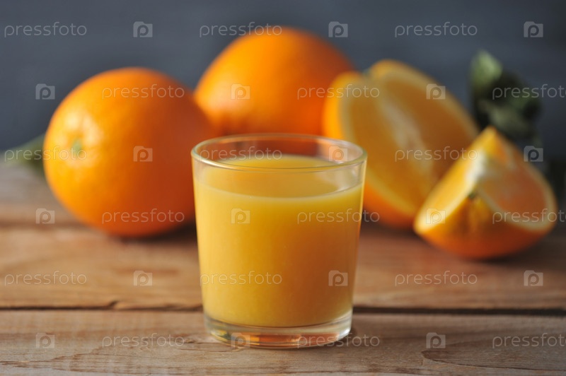 Стакан свежевыжатого апельсинового сока на фоне целых апельсинов