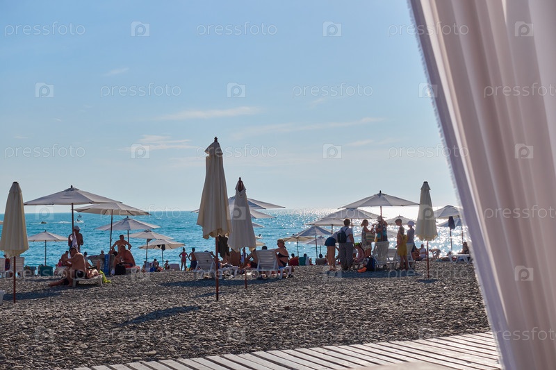 Отдыхающие на галечном пляже в Сочи. На гальке стоят шезлонги и зонтики. В море плавают водные мотоциклы и прогулочные катера