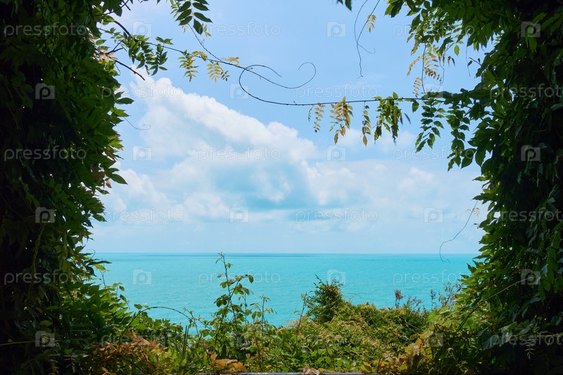 Вид на море из тропических растений. Вдалеке видно бирюзовое море, голубое небо и кучевые облака. Солнце светит в морских волнах