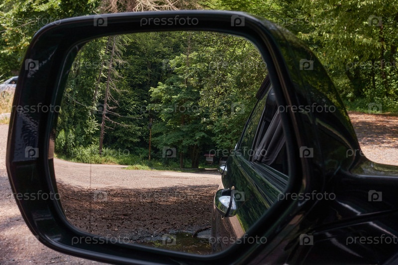 Вид на дорогу в лес через зеркало заднего вида автомобиля. Видно густую растительность и дорогу, усыпанную сосновыми шишками