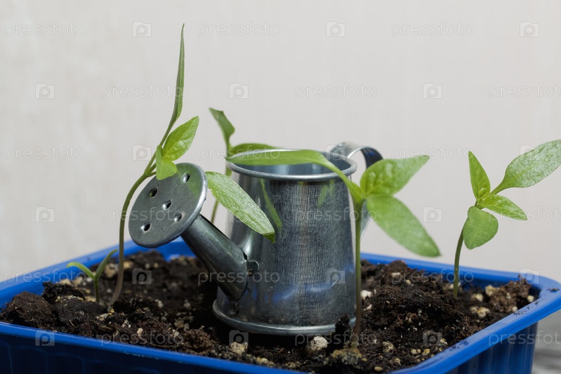 Зеленые ростки саженца. Выращивание рассады в пластиковом контейнере. Рядом с ним миниатюрная лейка. Крупный план