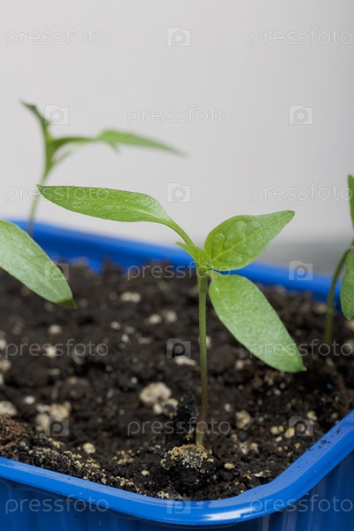 Выращивание рассады в пластиковом контейнере. Зеленые ростки саженца. Крупный план