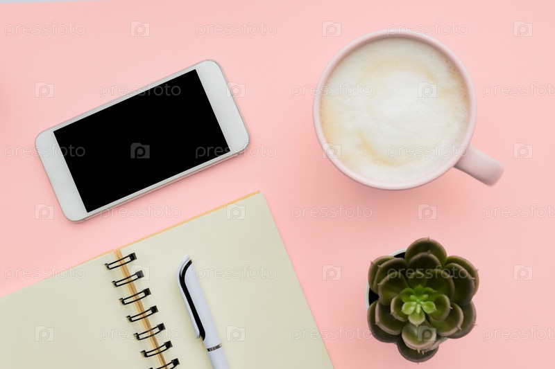 Рабочий стол феменини со смартфоном, пустой тетрадью, ручкой, чашей кофе на розовом фоне. плоская планировка, вид сверху
