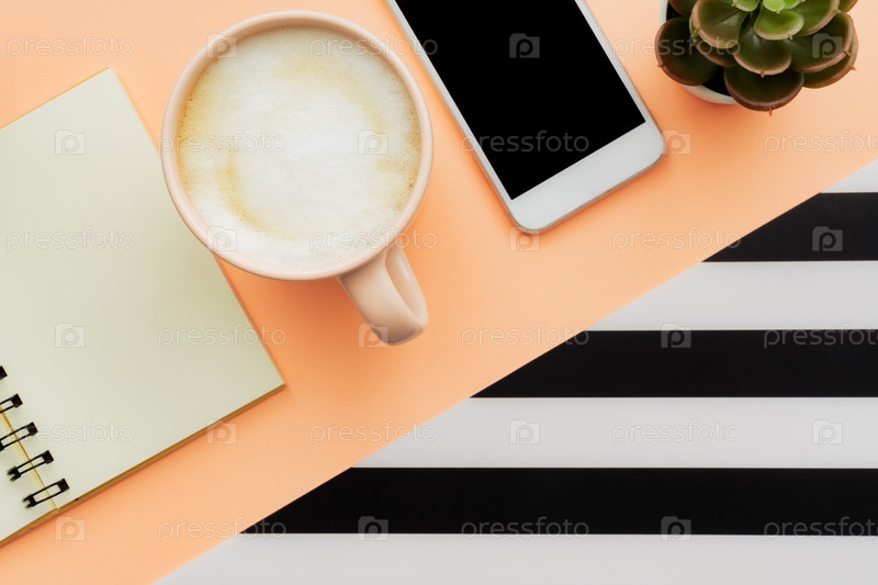 Современный белый офисный стол со смартфоном и чашкой кофе. Пустая страница блокнота для ввода текста. Вид сверху, плоская планировка