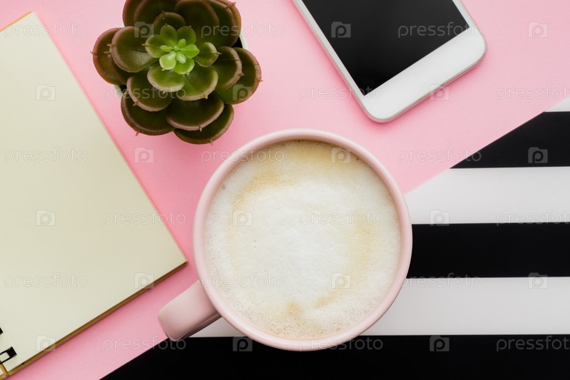 Вид сверху на рабочее пространство со смартфоном, чашкой кофе и местом для копирования на розовом фоне