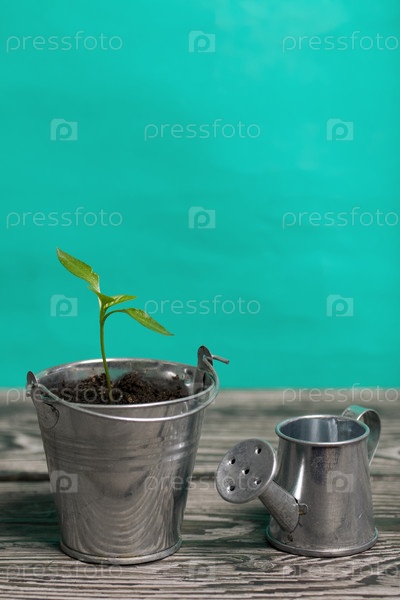 Выращивание рассады в миниатюрном металлическом ведерке. Рядом с ним миниатюрная лейка. Зеленые ростки саженца. Крупный план